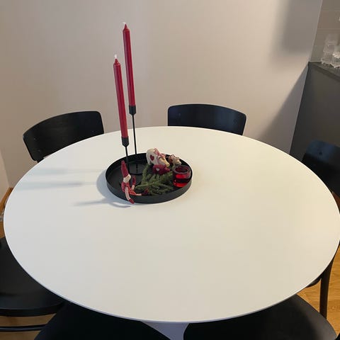 Valkoinen pyöreä Aino pöytä, halkaisija 110cm. Hyvässä ja siistissä kunnossa, tavallista kulumaa paikoin.