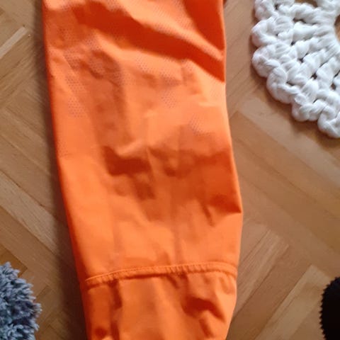 Pienemmälle koiralle itse tehty puku. Pituus selästä 30cm. Kevyttä kangasta, halkio alapuolella sekä kauluksessa.