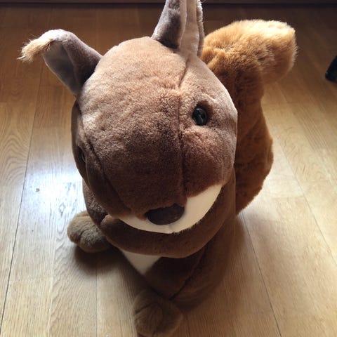 Uudenveroinen iso pehmo-orava, joka ei ole koskaan ollut lasten leikeissä. (Serlan keräilytuote vuosien takaa.) Kurren korkeus korvat mukaan lukien 39 cm