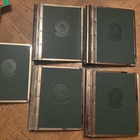 2 isoa nappia kotelossa ja 7 pienempää (puolen arkin) mappia kotelossa. Mercantil