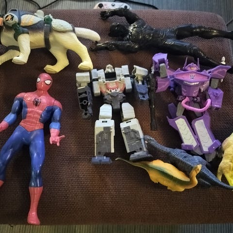 turtles hahmo, transformers, Hämähäkkimies ja moottoripyörä, 3 kpl metallisia pikkuautoja ( 1kpl x-men ja 2 kpl hot weels autoja), yms. mitä kuvassa näkyy.