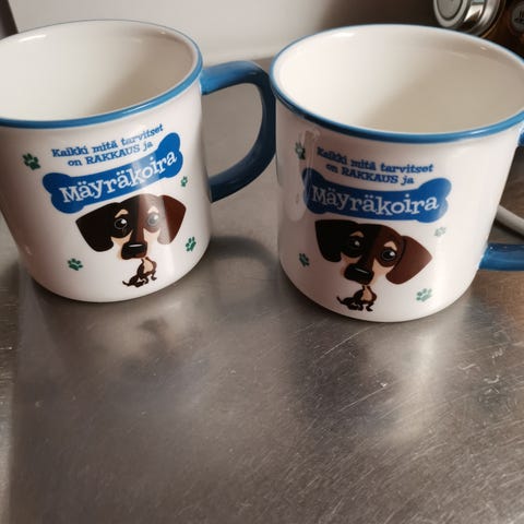 Uusi, käyttämätön, mäyräkoira-aiheinen muki.