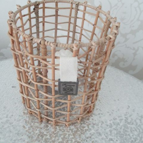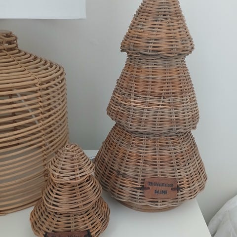 Riviera Maisonin punottu rottinkinen kuusi. Alaosa keramiikkaa, jossa paikka tuikulle Korkeus noin 38 cm. Kunto hyvä. Alunperinkin tekstit alaosassa olleet kulutetun näköiset.