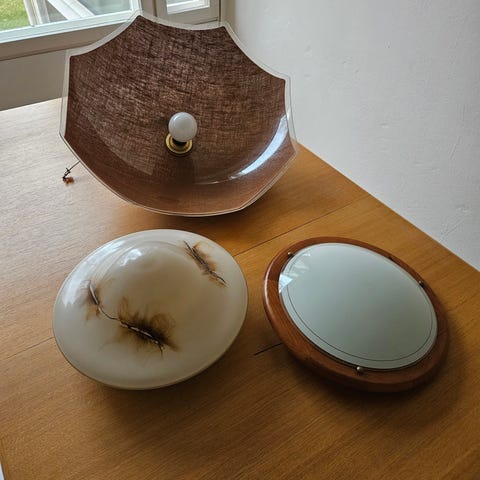 Metallinen kattovalaisin kehikko, johon on olemassa lamppukuvut ja lamput. Ei tietoa toimivuudesta. Koko n. 60x60cm