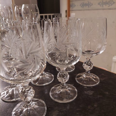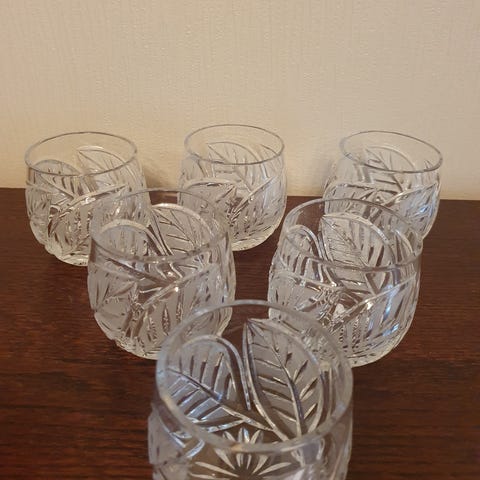 6 kpl kristallilaseja, metallisella ulkopohjalla. Korkeus 5 cm. Käyttämättömät.