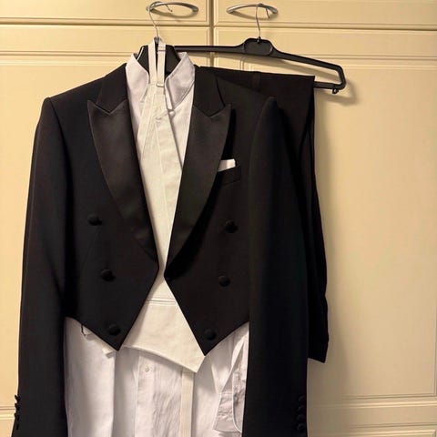 Frakkitakki, housut, paita, liivi, henkselit, rusetti, käsineet, kalvosinnapit ja helmiäisnapit. Sopiva +/- 190 cm solakalle henkilölle. + lakerikengät koko 44.