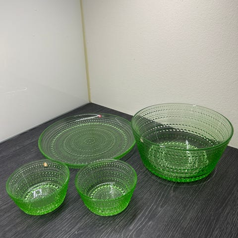 Myydään Iittalan kastehelmen siniset tarjoiluastiat. Tarjoilulautasen halkaisija 25 cm, pienen kulhon halkaisija 15 cm ja korkeus 8 cm.