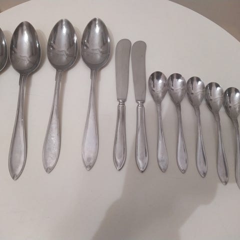 Pakkauksessa haarukka, veitsi, lusikka ja teelusikka, 6 kpl jokaista.