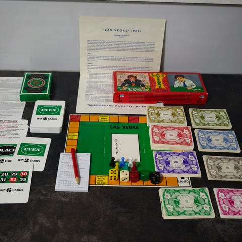 - Pahvinen suorakaiteen muotoinen peruspelilaatikko, jossa mukana pahviruletti sekä muutama avattu karkki