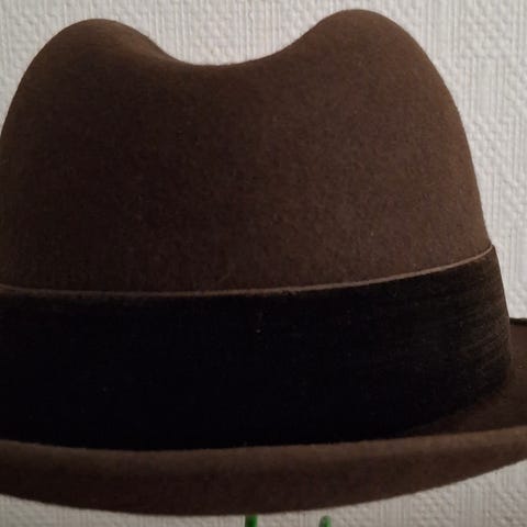 Vanha musta miesten huopahattu, koko 55. Hatussa ei ole vuorta eikä sisäreunassa nauhaa. Myös koristenauha ulkopuolelta puuttuu. Lierin reunan huolittelunauha on osittain huonosti ommeltu, pitää korjata. Hatussa molemmilla sivuilla pieni pyöreä reikä, ehkä jonkin koristeen tai kaulanauhan kiinnitystä varten ollut. Postitus tai nouto.