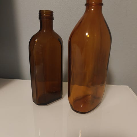 Kaksi kappaletta kuvan mukaisia, 35 cm korkeita pulloja. Kunnoltaan siistit ja ehjät, pitävät vettä.