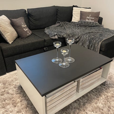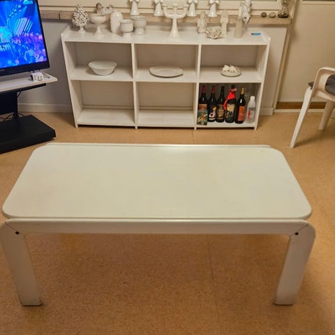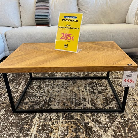 Kotimaisen Rintaluoman valmistama Aari sohvapöytä. Valmistusmateriaali kalustelevyä, jalat maalattua puuta.