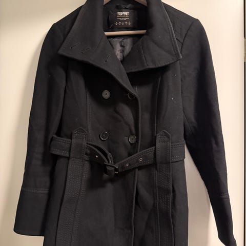 Musta vähän käytetty villakangastakki. Vino vetoketju, ei huppua. Koko 34-36. Hyväkuntoinen (kuvissa vähän ryppyinen).