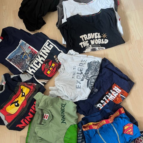 Myydään lasten T-paitoja yhden lapsen jäljiltä. Kaikki kutakuinkin samaa kokoa (128 cm).