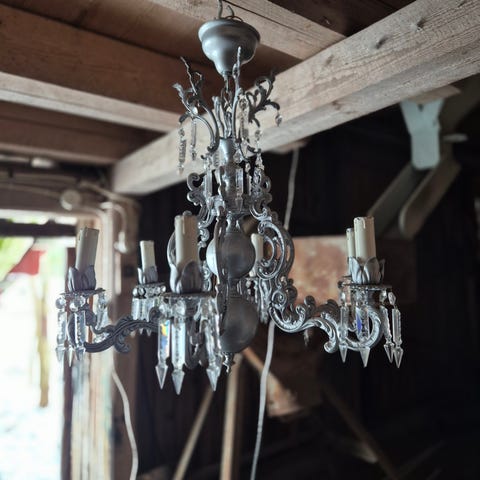 Kaunis kymmenhaarainen kattokruunu kaipaa uutta kotia. Upeat posliiniset kukkakranssit ja rungon ”kuvut”. Ostettu aikanaan Fasetista.