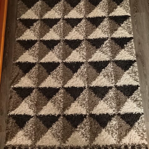 Hyväkuntoinen ja äskettäin pesty tuuhea hopeanharmaa karvalankamatto.