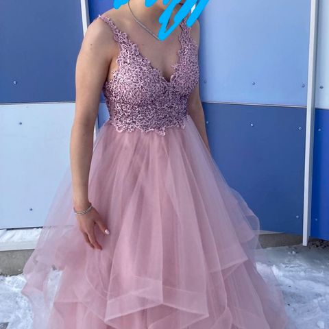 Käyttämätön vanhojentanssimekko. Tehty mittatilauksena n. 160 cm pituiselle, koko XS-S. Takana nyörikiinnitys, joka mahdollistaa säätövaran puvulle. Väri tumman petrolinsininen.