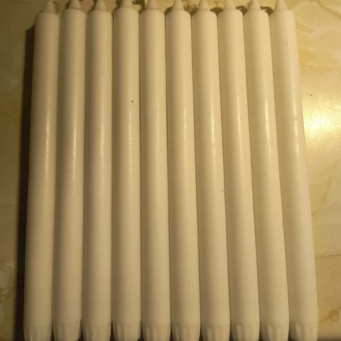 8 kpl valkoisia ohuita kynttilöitä. Pituus 40 cm. Kynttilän koko n. 8mm.