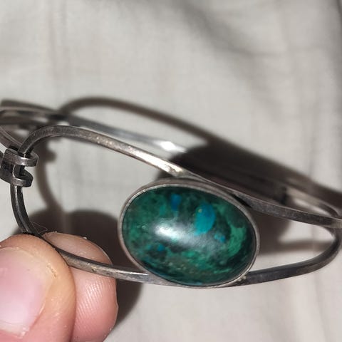 Käsintehty antiikkinen persialainen (lähi-itä) hopea rannekoru. Käsikorun takana on lukko jolla voi säätää kokoa.