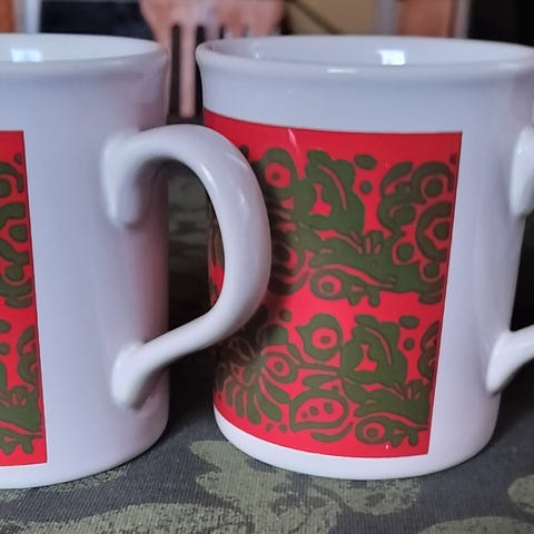 Marimekon muki retro, 80-90 luku, valmistettu Englanissa harvinaisia, uniikkeja. Mukeja on 5 kpl, hinta 10 €/ kpl.