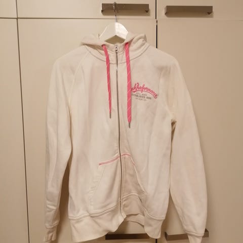Naisten valkoinen Peak Performance huopari. Koko L. Hyvä metallinen vetoketju, mutta vedin puuttuu, vetoketju toimii silti hyvin. Hupun nauhat poistettu.