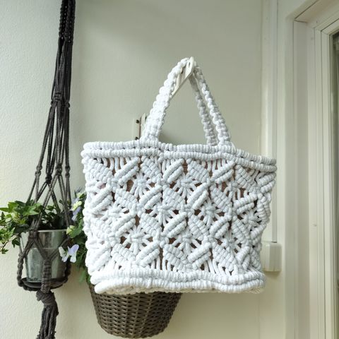 Myydään uusi, vuorillinen macrame pussukka koko 22 x 15 cm.