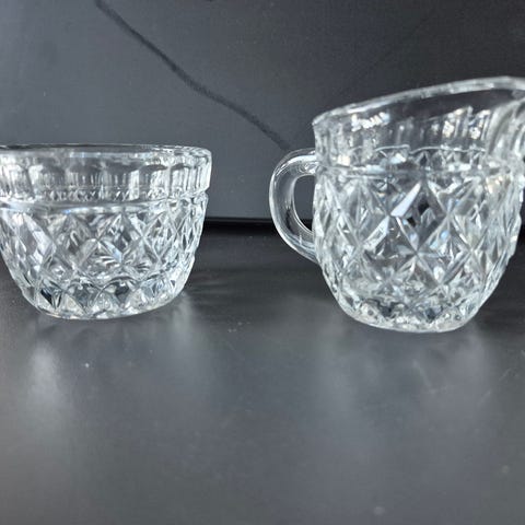 Kuvanmukaiset, ehjät, uudenveroiset lasiset, retro kermakko ja sokerikko, valmistajasta minulla ei ole tietoa. Sokerikon kokonais korkeus 8 cm, jalkaosan korkeus noin 2,5 cm, yläreunan halkaisija 8,5 cm, vihreän jalkaosan alareunan halkaisija n. 4,5 cm. Kermakon kokonaiskorkeus 10 cm, yläreunan halkaisija 6 cm. Hinta yhteensä 12 euroa. Nouto tai postitus; myös ToriDiili -lähetys sopii.
