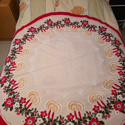 Joululiina pyöreä punainen pellava. Tämä liina on koristeltu jouluisilla kukkakuvioilla ja punaisella reunuksella. Se sopii erinomaisesti joulun ajan kattauksiin ja tuo juhlatunnelmaa kotiin. Materiaalina on pellava, joka on kestävä ja helppohoitoinen.