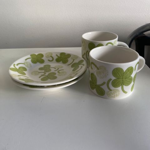 Arabia kahvikuppi ja lautaset täysin kuin uudessa kunnossa. Kauniit ja kiiltävät hyvän onnen apilat ♡. Kupin korkeus 6 cm ja halkaisija 7,4 cm. Lautanen 14 cm ja leivoslautanen 16,5 cm. Koristeen on suunnitellut Birger Kaipiainen.