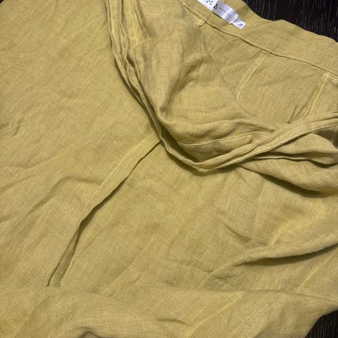 Kuvien mukainen kauniisti laskeutuva pellavahame. Sivulla vetoketjukiinnitys ja sivuilla myös pienet taskut. Hyväkuntoinen. Menee mielestäni hyvin myös S kokoiselle. Joitakin mittoja löytyy kuvista. Koiratalous, joten jokunen karva voi tulla mukana putsauksesta huolimatta.