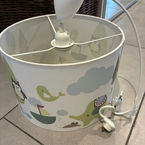 Hempeän vaaleanpunainen (kuvassa väri ei pääse oikeuksiinsa), kukan muotoinen kattovalaisin, jonka kankaalla verhoillussa varjostimessa valkoisia tähti- ja kuukuvioita. Korkeus 18 cm, halkaisija leveimmillään n. 24 cm. Lamppu E27-kantainen, ei sisälly kauppaan. Erinomainen kunto.