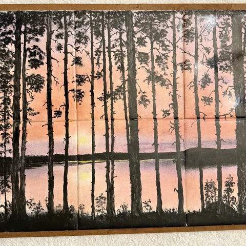 Kreikkalainen kaakeli taulu jossa on kolme kreikkalaista sotilasta ja kaksi hevosta