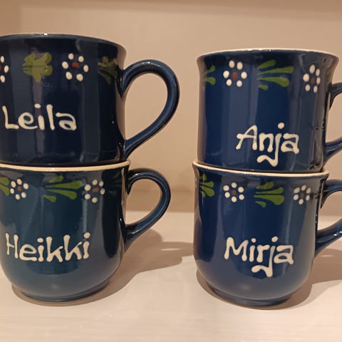 Myydään kuvan nimimukit, 10e/kpl. Vain nämä mukit löytyy, jotka on kuvassa. Nouto Hattulasta tai ostajalle postikulut 8.90e, myynnissä myös muualla.