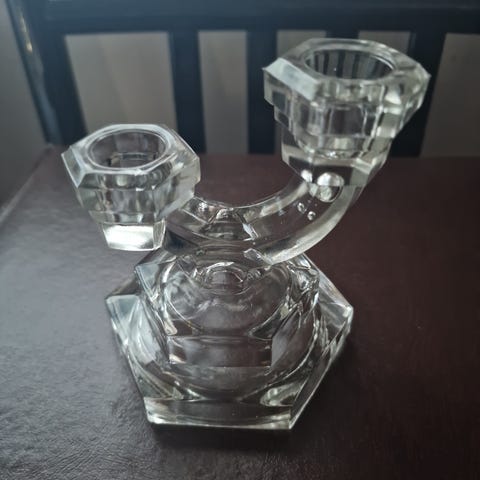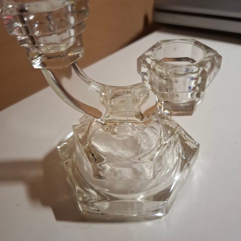 Myynnissä kuvan Riihimäen lasin kynttilänjalka, korkeus 12, leveys 18,5, jalustan Ø 11 cm, happohimmennettyä, mattaa lasia.