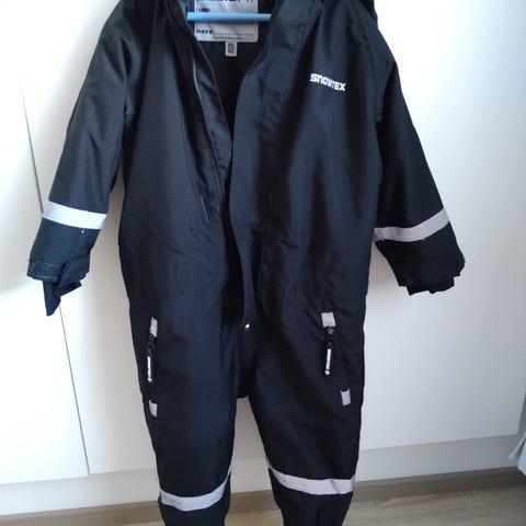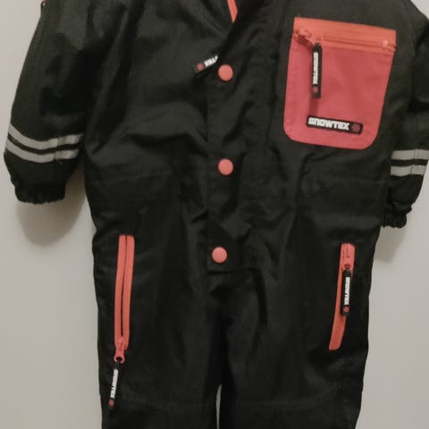 Poikien toppahaalari Snowtex 86/92. Lahkeissa lumilukko ja saapaslenkki. Vyötäröllä kiristys. Hihoissa lumilukko myös. Irroitettava huppu. Polvissa kulumaa, mutta ehjät.
