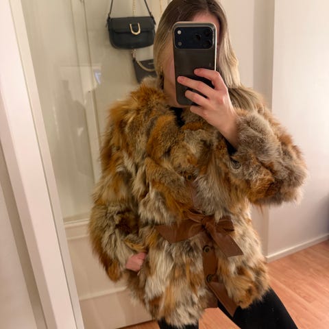 Turkki on vanha ja käytetty, mutta täysin ehjä. Sivussa on taskut ja hyvän mallinen huppu. Hartioiden leveys on noin 40 cm ja olka/helma pituus on noin 72 cm. Turkki sopii xs tai s kokoiselle.