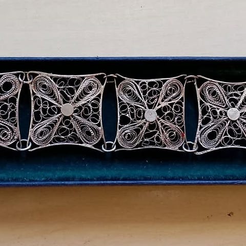Kaunis vanha filigraani rannekoru. Pituus 16,5 cm. Postitus onnistuu.