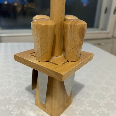 4-osainen juusto-otin setti puunvärisessä pakkauksessaan. Kaksi käyttämätöntä, toiset olleet kaksi kertaa käytössä.