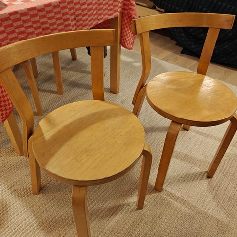 Kuin uudet, yönsinisellä huonekalukankaalla verhoillut Artekin 611-tuolit. Yhteishinta 4 kpl 840 €.