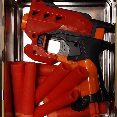 Kolme kpl Nerf aseita. Yhteen menee kolme aamusta ja muihin yksi. Ammukset tulee mukaan