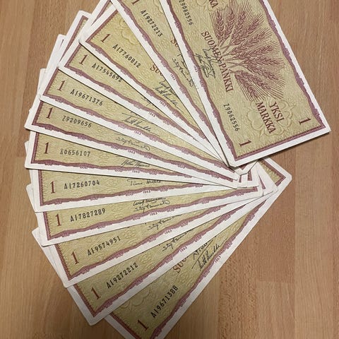 Myyn viisi kpl hiippukuntoisia markan seteleitä. Hinta vain 3 eur/kpl.