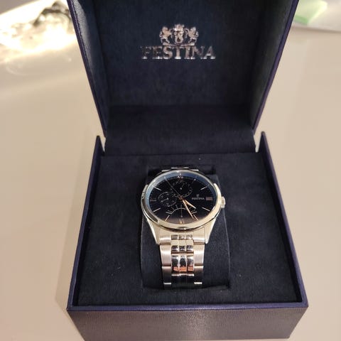 Myytävänä Festina rannekello F16237/1. Kaksivärinen, päivyri, vesitiiviys 5ATM, taulun halkaisija 3,6cm.Käyttämätön. Hinta 55e+postikulut, laatikko löytyy.