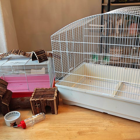 Mökkejä, juoksupyöriä, muita virikkeitä, ruoka ja juoma kuppeja sekä juomapullo, kuljetusboksi, tunneli, juoksupallo. Kaikki ovat hyvässä kunnossa ja tässä on kaikki mitä hamsteri tarvitsee. Ruokaa tai kuiviketta ei tule mukana. Häkin mitat ovat pituus 80 korkeus 40 leveys 50