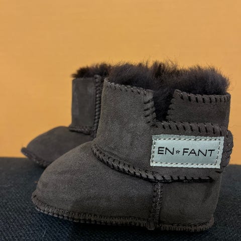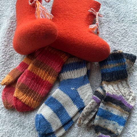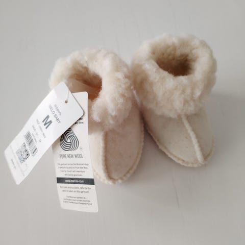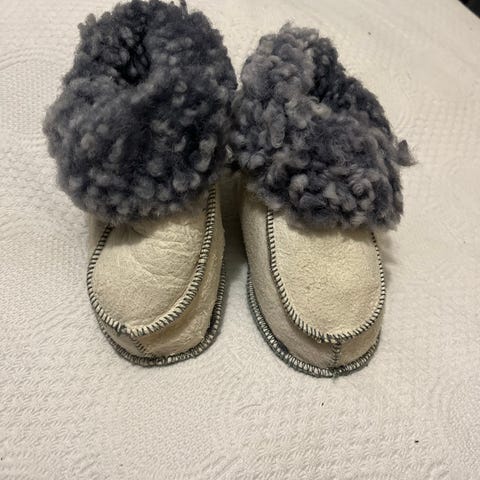 Yhden lapsen päiväunilla käyttämät lampaanvillatöppöset jarrupohjalla. Pohjan sisäpituus raksamitalla n. 12 cm.
