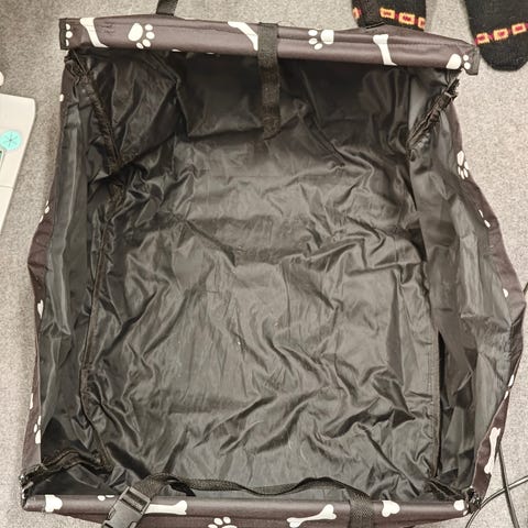 Etupenkkien väliin viritettävä suoja. Estää lemmikkien tulon etupenkille ja muutamia tavaroita mahtuu pusseihin. Ei oo tullut käytettyä