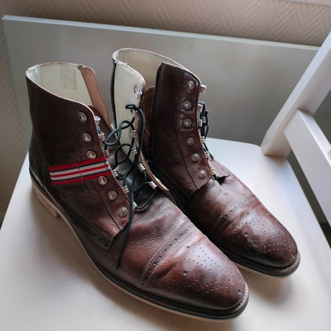bootsit koko 44 mustaa nahkaa. Kengissä on koristeellinen kuviointi ja ne soveltuvat erilaisiin käyttötarkoituksiin.