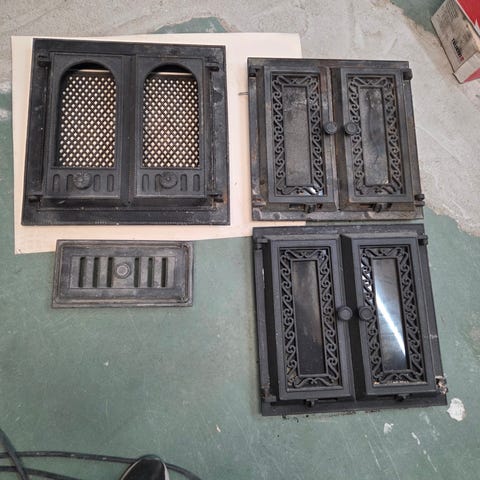 Leivinuunin lasiluukku Pisla? ja 2 tuhkaluukua ja savupelti kehyksineen.