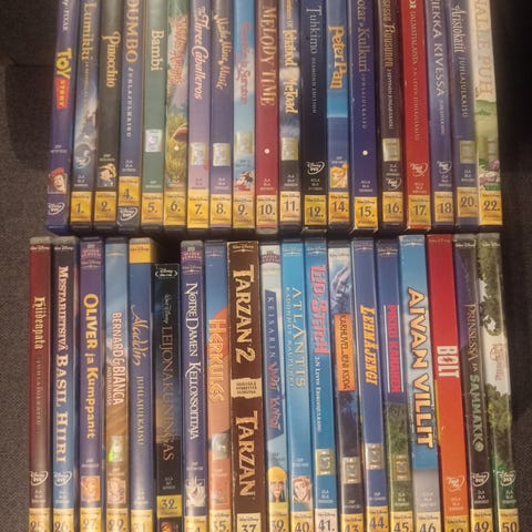 Disney-klassikoita ja vähemmän klassikoita joista Oliver ja kumppanit, Urhea, Autot ja Hercules ovat erinomaisessa kunnossa. Karhuveljeni Koda 2, Aivan villit, Lizzie McGuire ja Tarzan 2 ovat naarmuisempia, mutta kuitenkin täysin katsottavassa kunnossa. Kaikki kotelot ehjiä. Myydään yksittäin tai useampi kerrallaan. Hinnat per dvd.