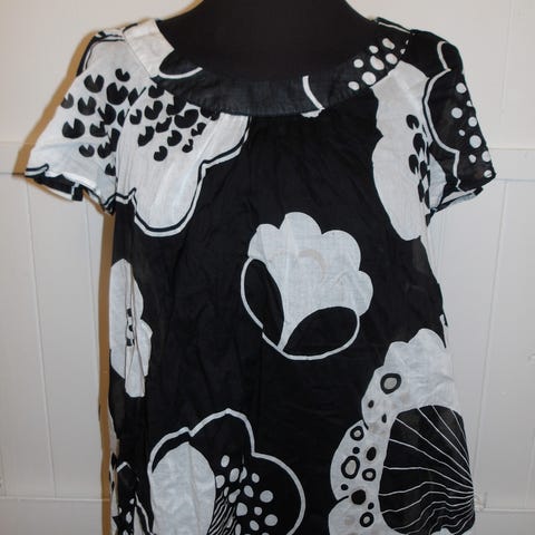 Kaunis kukallinen tunika myyntiin. Kokolapussa merkintä L, minusta kokoa M. Erittäin kiva malli, erikoisempi kaula-aukko ja vyön voi solmia ympäri tai taakse. Postitus ok.