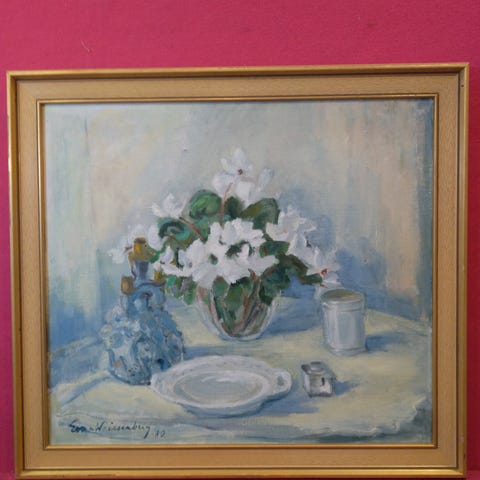 Tatjana von Schwanck-Väänäsen öljyvärityö Kangasvuokkoja. Työn korkeus on 26 cm ja leveys 28 cm. Kehys 34 X 36 cm.